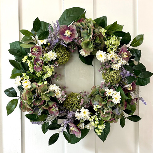 Faux Fabulousness! - Adorn your home with this beautiful 22” vintage floral wreath created by Beth Johnson of Terra Coastal Design. This gorgeous faux creation features antique green and purple hues with hydrangeas, hellebores, viburnum buds and lavender sprigs. Made with highly quality stems, this realistic, all-season wreath will maintain its vibrancy for years to come and may be displayed inside or outdoors with protection.